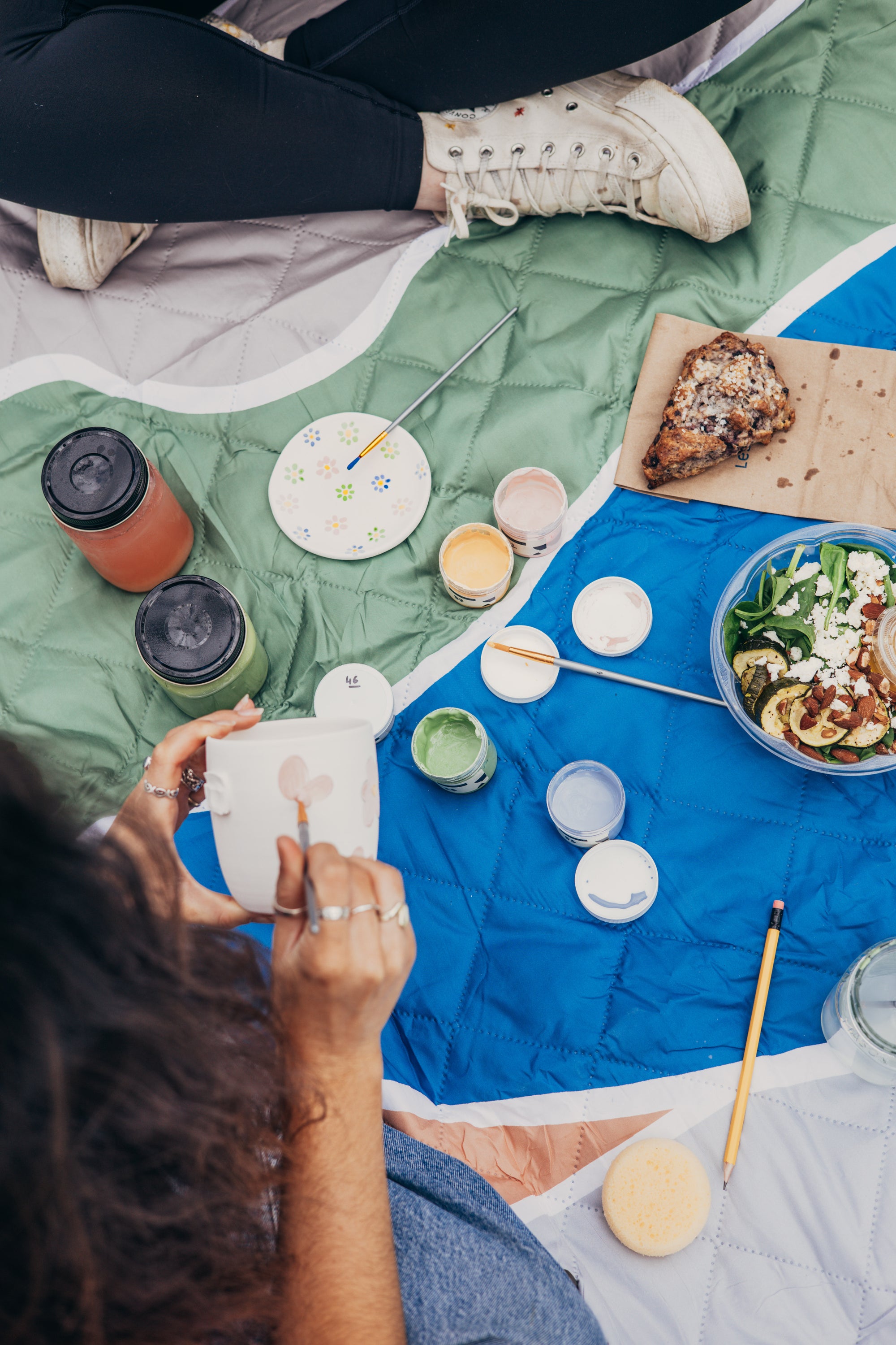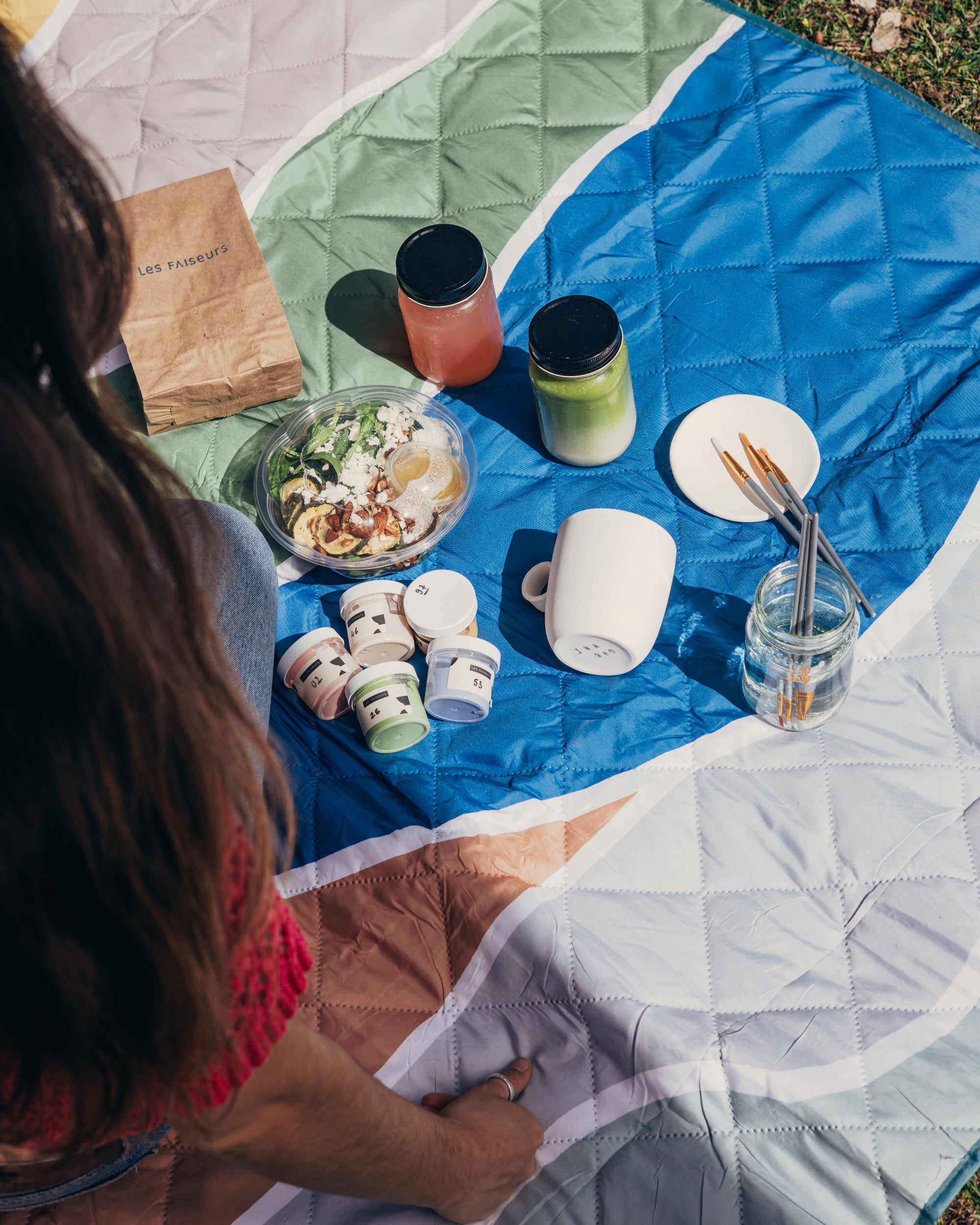 Pour rendre l’expérience simple, pratique et plaisante, nous vous préparons un sac contenant tout le matériel nécessaire : des pinceaux de plusieurs formats, des crayons, aiguise-crayon, ruban à masquer et ciseaux, et une nappe de pique-nique, pour que vous puissiez vous installer confortablement.