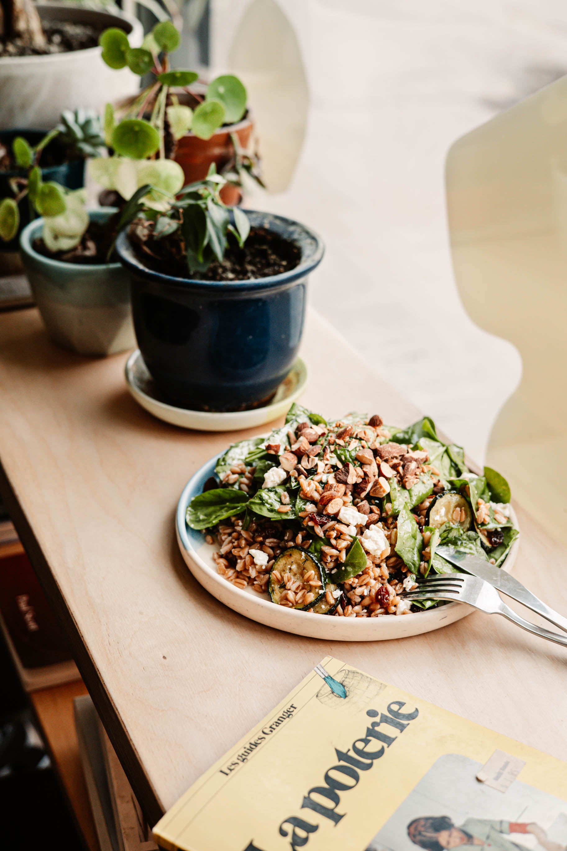 - Salade farro: farro, asperges du Qc, feta, raisins secs, aneth et bébé épinards, vinaigrette au citron, noix grillées