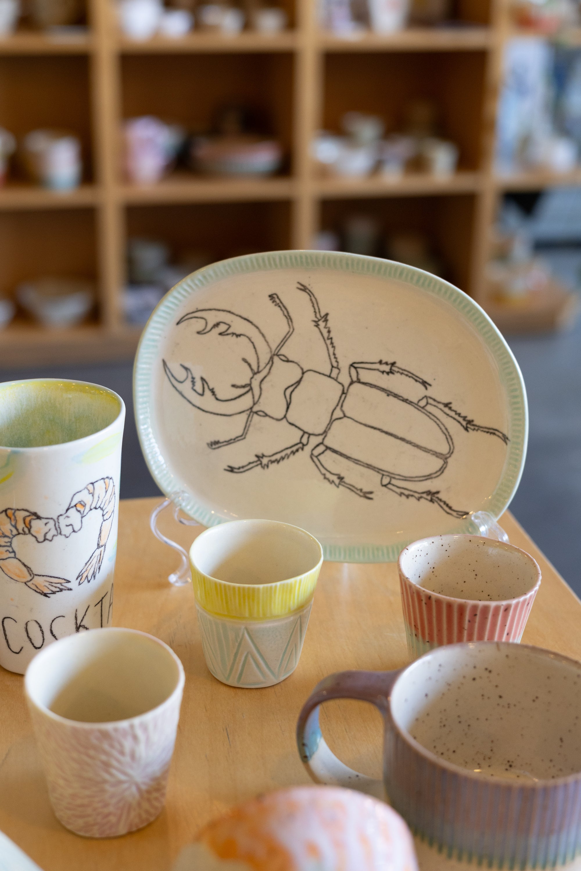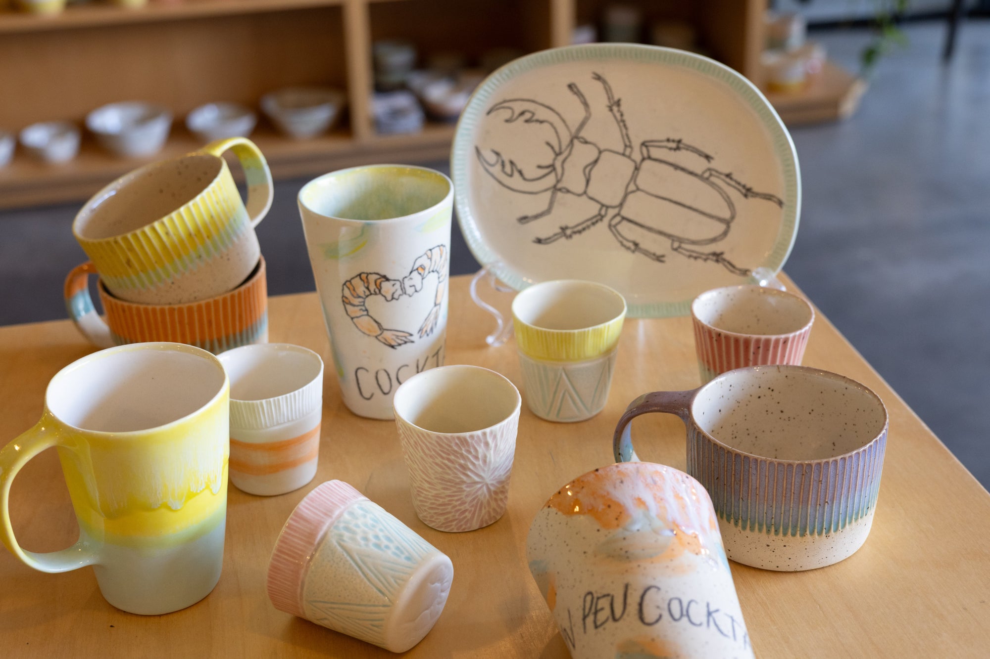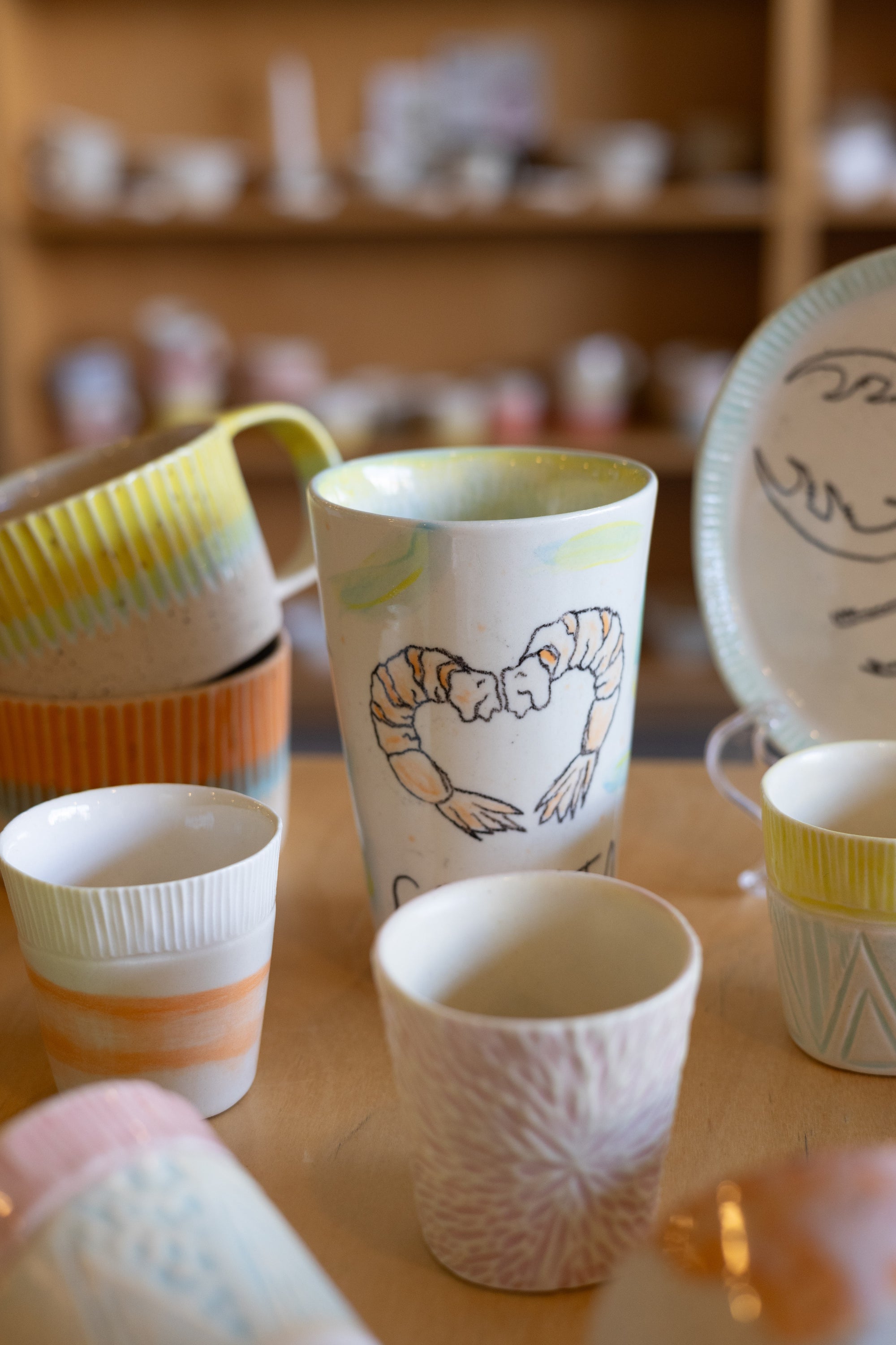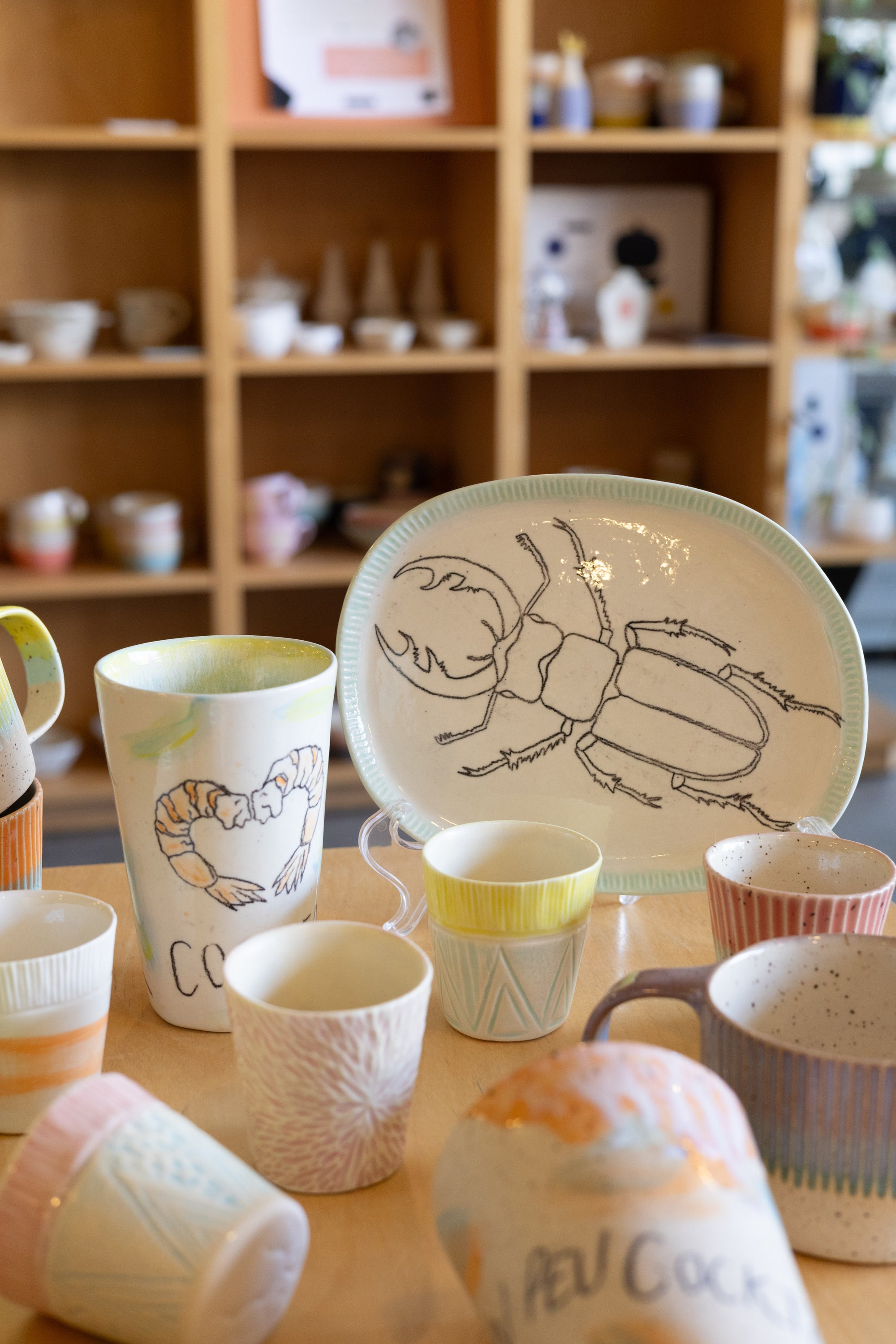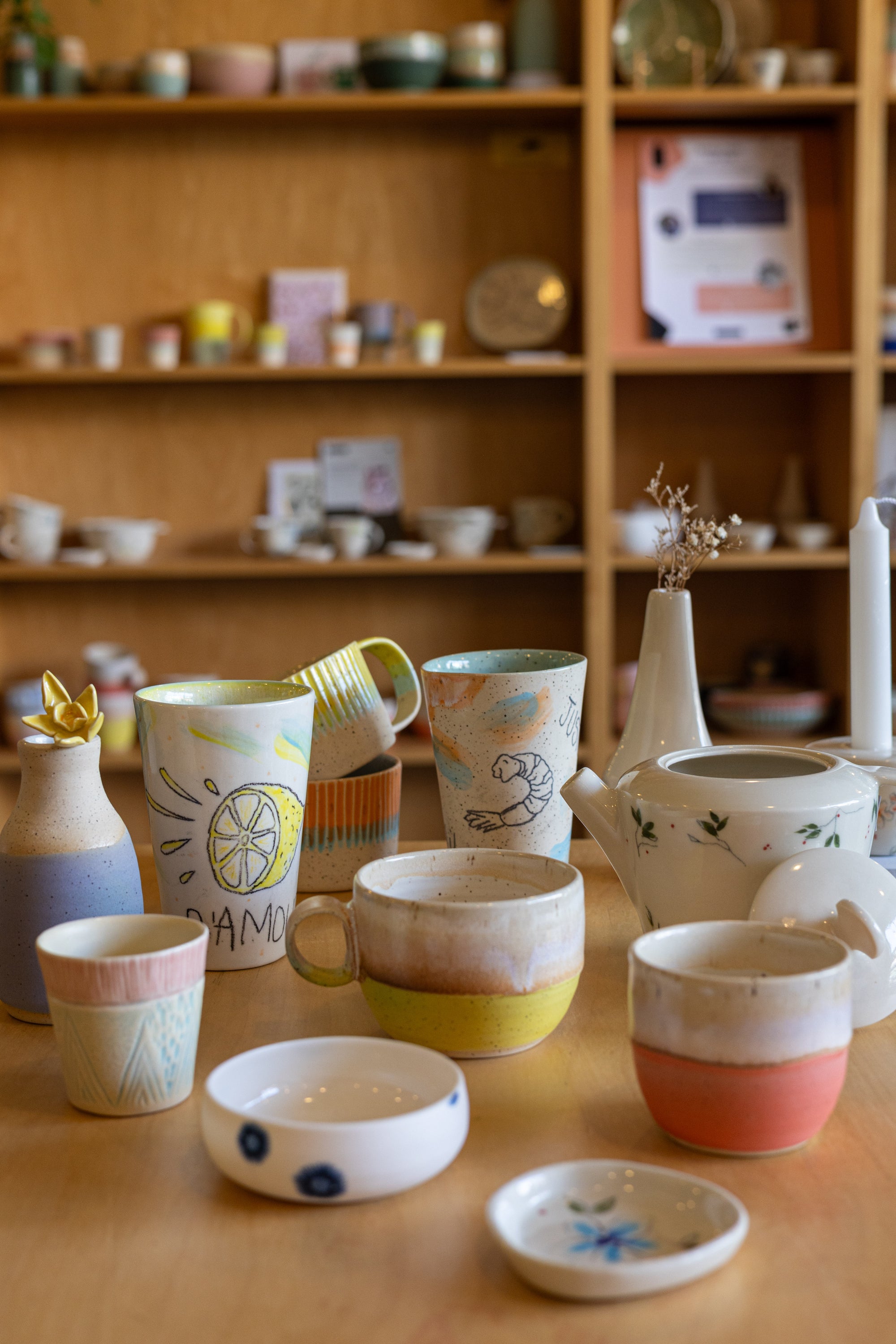 Tasses vibrantes, gobelets funky, mini tasses à espresso aux motifs organiques, assiettes dont les bords sont gravés : chaque création est une pièce unique, façonnée à la main et avec un mélange de glaçures aux couleurs très pigmentées. Ça respire l'été et la joie!